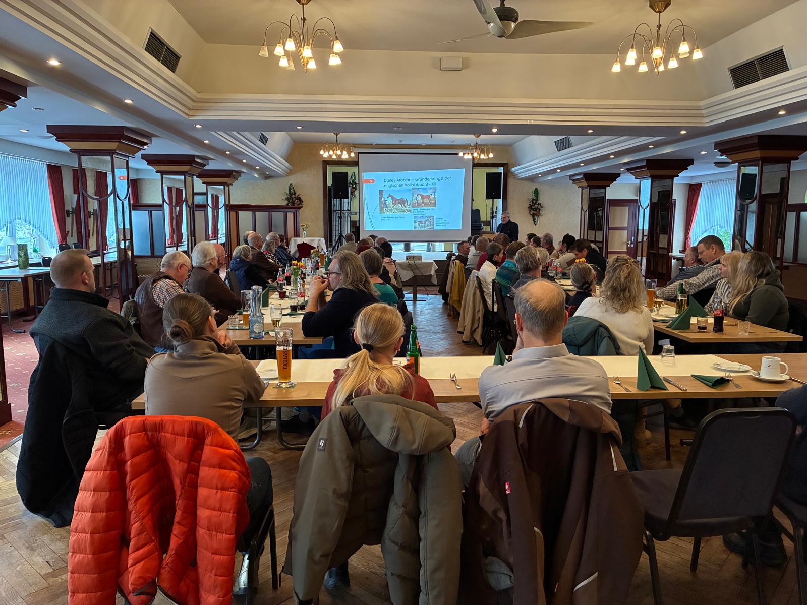 Bevor der Kohl gereicht wurde, gab es einen interessanten Vortrag über das Vollblutaraber OX Pferd von dem renommierten Zuchtrichter und Kenner dieser Rasse Burchard Schröder. Während seiner Power Point –Präsentation informierte Burchard Schröder die anwesenden Zuhörer über die geschichtliche Entstehung und Entwicklung dieser Pferderasse. Sehr interessant und Beeindruckend waren die Erlebnisse der Zuchtschauen mit Fotos von den vielen Veranstaltungen in Saudi Arabien, Oman, Ägypten oder Dubai, VAE usw. die uns Burchard Schröder näher brachte. Er ist ein international anerkannter Experte dieser Rasse und somit weltweit gefragt.