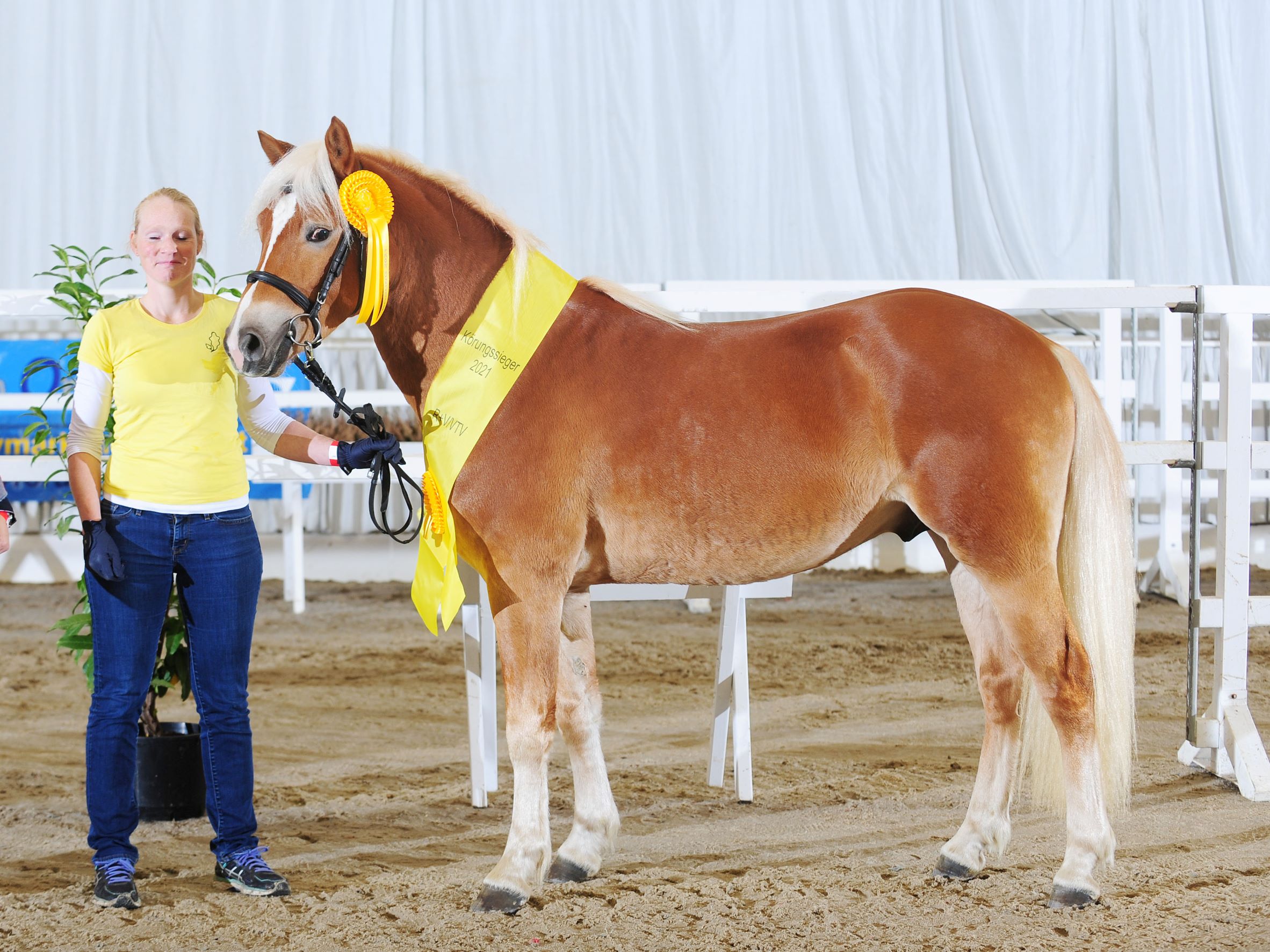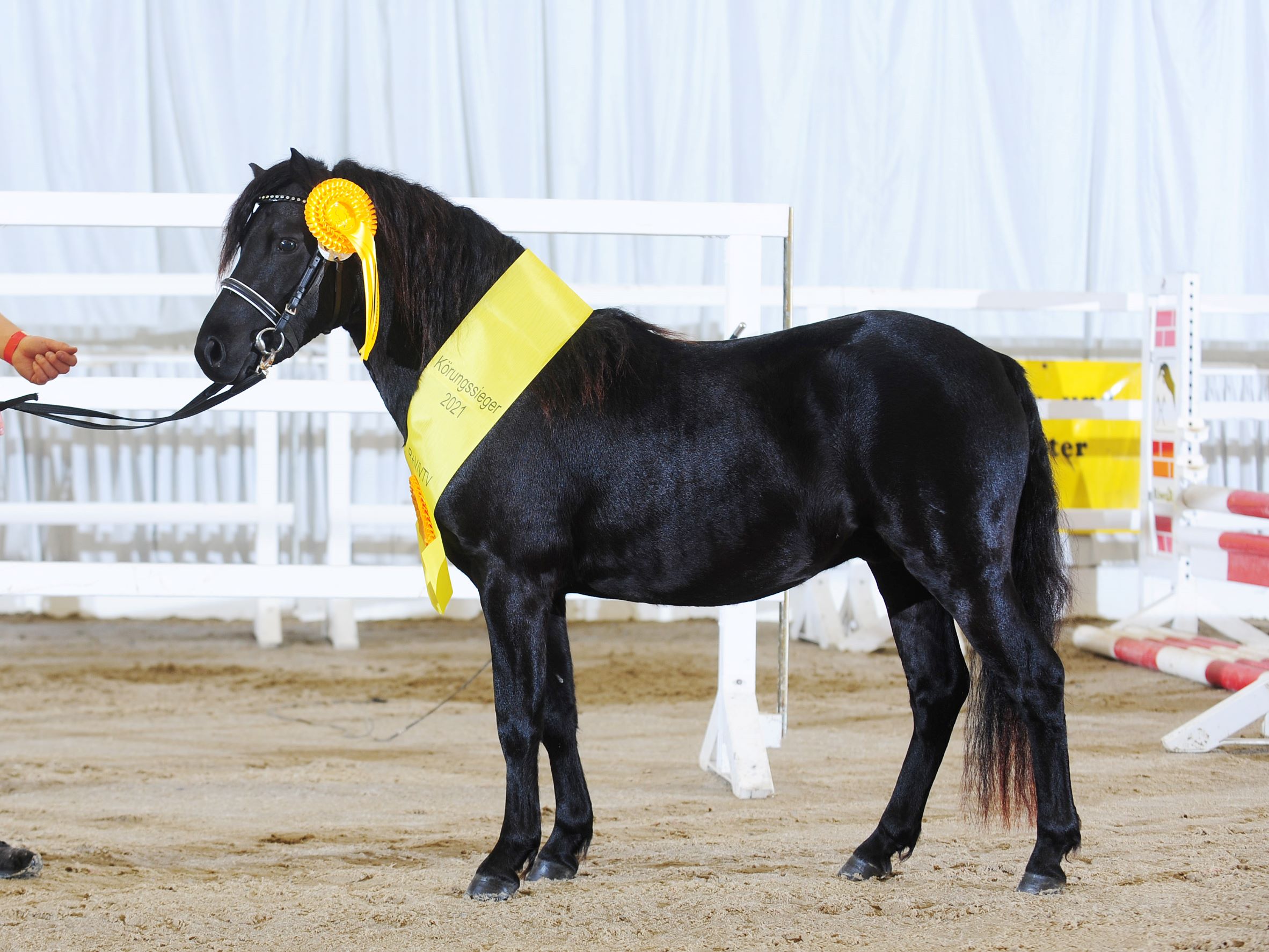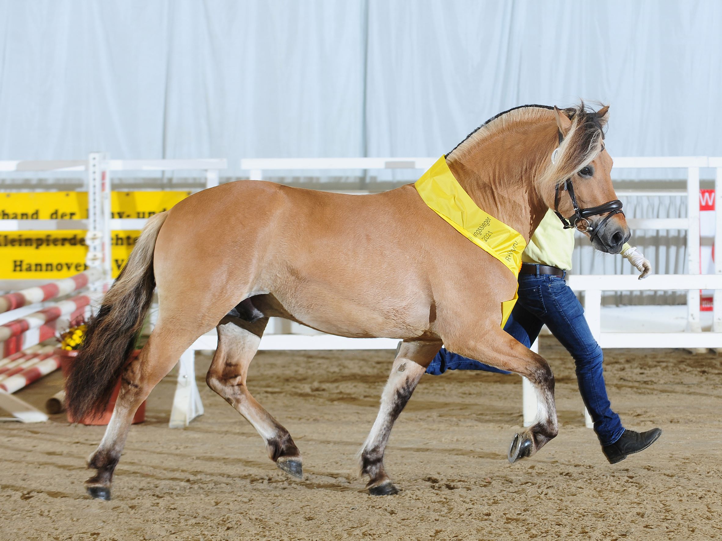 Der Fjordhengst Donar v. Darion x Helge, Züchterin Heike Niederkrome, Loxstedt ausgestellt von Michaela Uzelac, Heppenheim, erhielt das positive Körurteil, die Prämienanwartschaft sowie den Siegertitel. Der ausdruckstarke Hengst präsentierte seine Stärken mit leichtfüßigem Trab, ausbalanciertem durchgesprungenem Galopp und überzeugte auch mit seinen guten Ansätzen beim Freispringen. Dieser Hengst errang seiner Besitzerin eine Silbermedaille der FN sowie einen Ehrenpreis der Firma Küchentreff, der durch die Vertreterin Bettina Büscherhoff überreicht wurde.