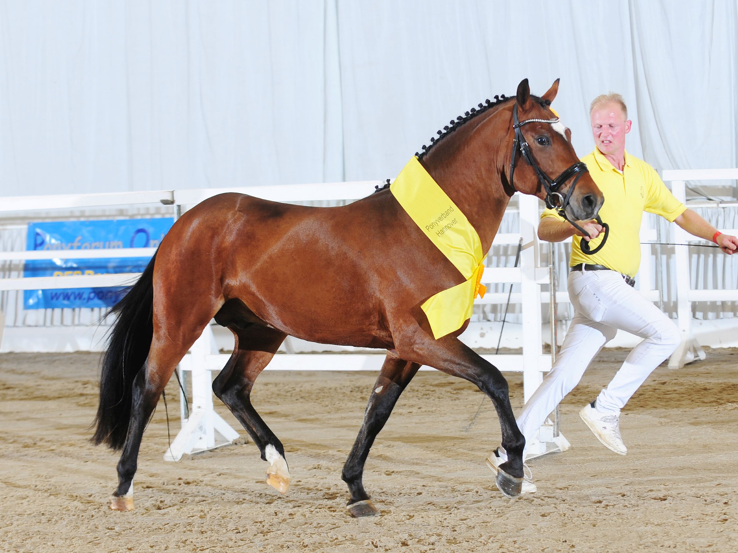 Im Anschluss der Ehrungen stellten sich die Deutschen Reitponyhengste vor. Von 70 vorgestellten Reitpony Hengsten auf den Vorauswahlen wurden 40 Hengste ausgewählt. Nach Verden kamen letztendlich 32 Hengste, davon konnten 25 Hengste das positive Körurteil erhalten. Aus dieser großen Gruppe der Deutschen Reitponys wurden 9 Hengste als Prämienhengstanwärter herausgestellt und qualifizierten sich somit für den Endring.