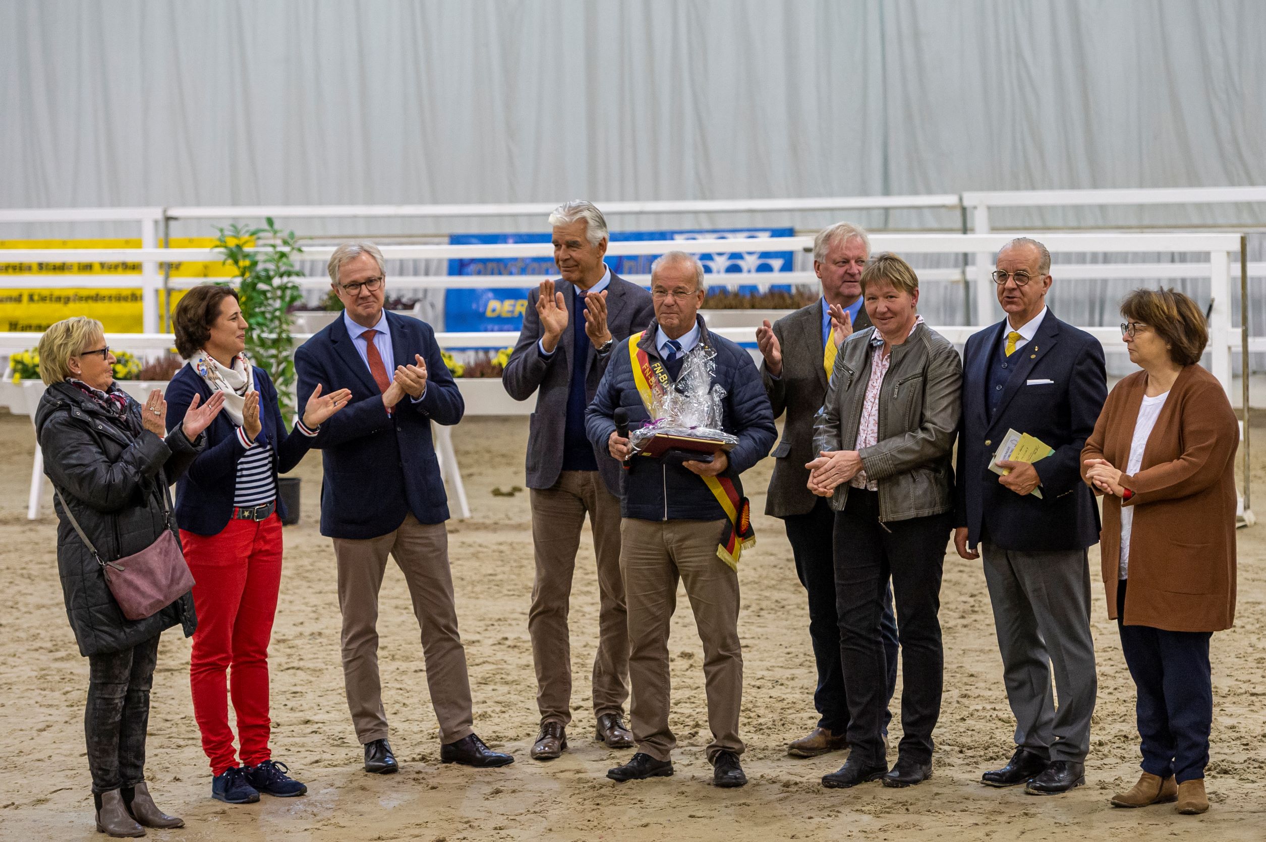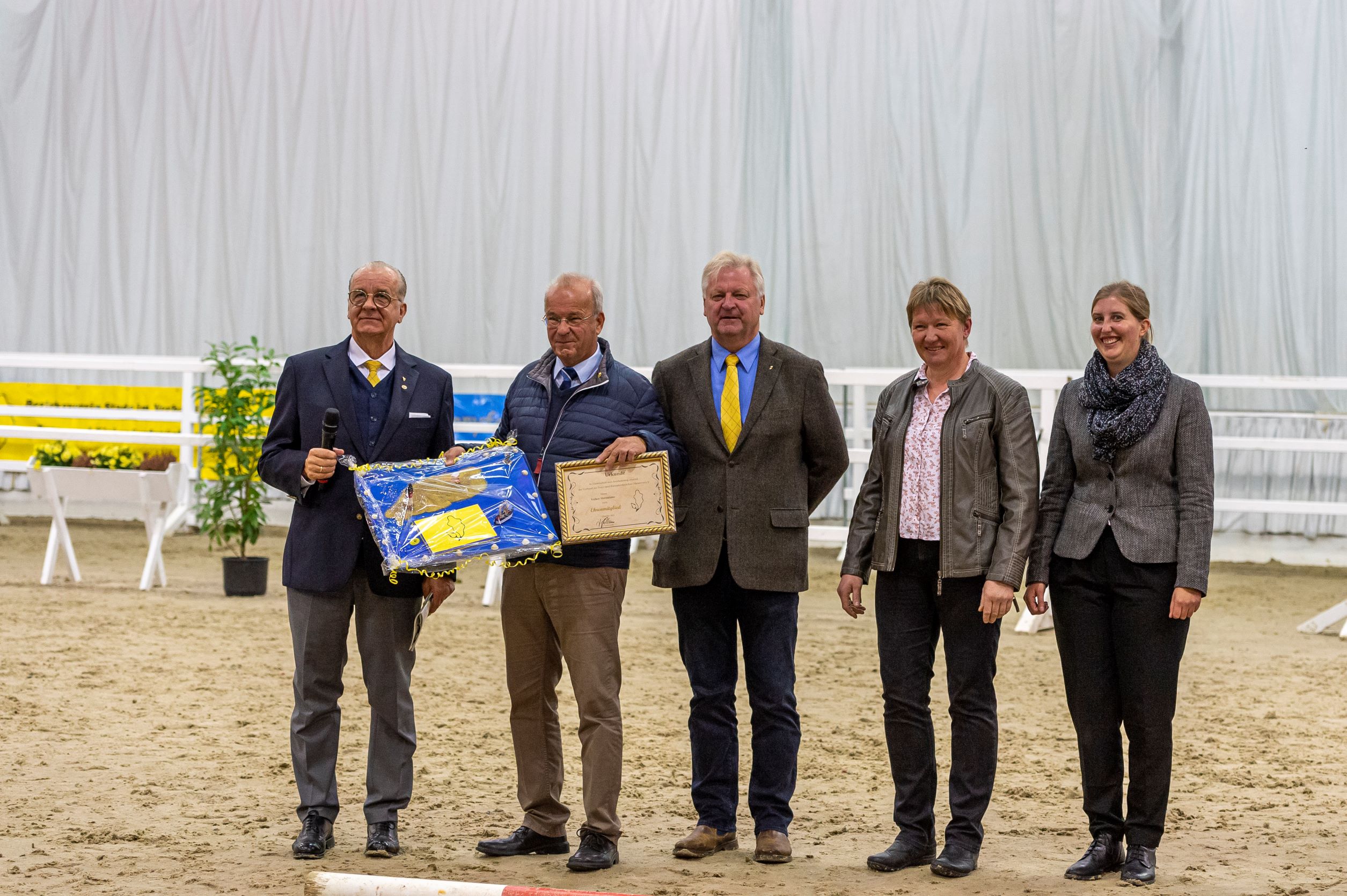 Der Vizepräsident der Deutschen Reiterlichen Vereinigung (FN) und Vorsitzender des Bereichs Zucht, Theodor Leuchten ehrte Volker Hofmeister mit der Gustav-Rau-Medaille in Silber und bedankte sich für sein vielseitiges Engagement auf zahlreichen Veranstaltungen, in vielen Arbeitsgruppen, Rassebeiräten und verschiedenen Gremien. Vom Geschäftsführer des FN Bereichs Zucht, Dr. Klaus Miesner, sowie der stellvertretenden Geschäftsführerin Dr. Teresa Dohms-Warnecke und Mitarbeiterin des Bereichs Zucht Martina Kuypers wurde zusätzlich auch eine symbolische Schärpe, Warendorfer Pferdeäpfel sowie eine Erinnerungsfotocollage überreicht. Auch das Publikum brachte seinen Teil zu diesem besonderen Moment mit einem stehenden Applaus.