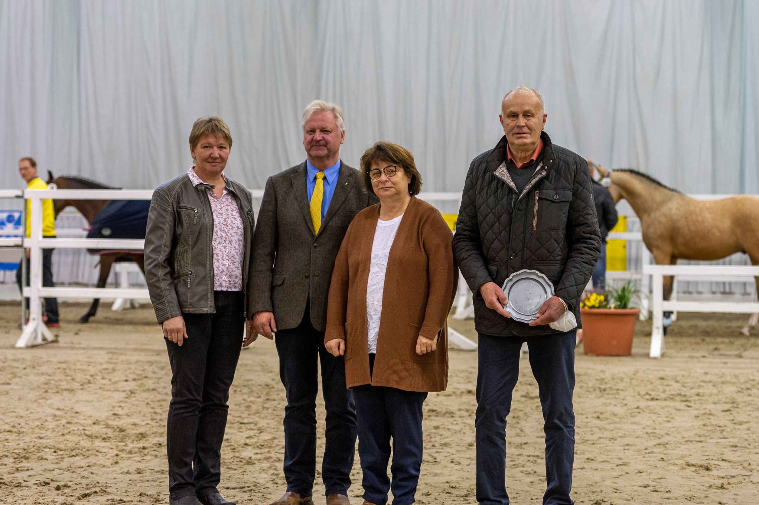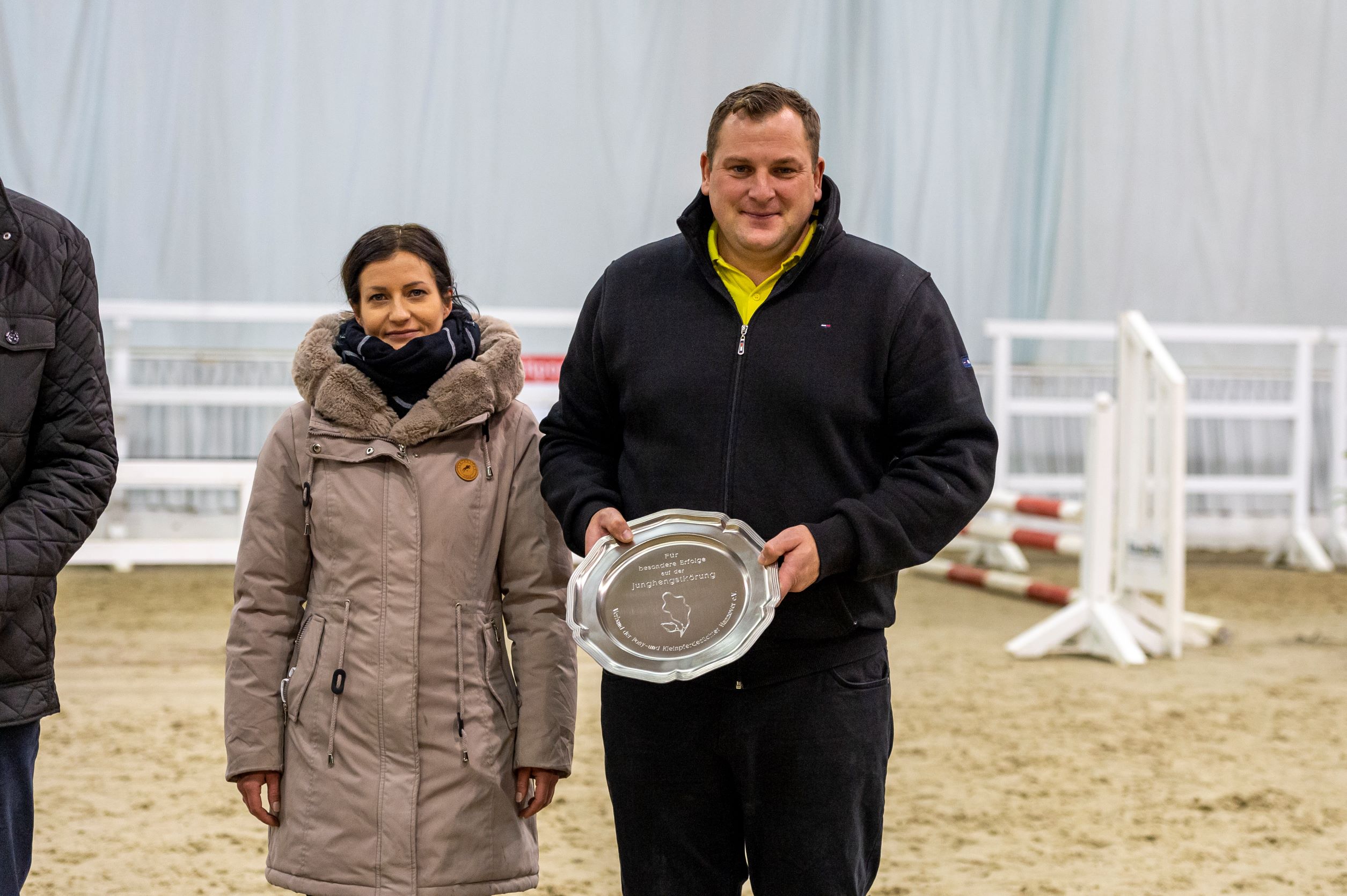 Der Preis für besondere Erfolge auf der Junghengstkörung wurde dieses Jahr an Adolf Theo Schurf aus Bedburg vergeben. Er stellte seit 2013 über 30 gekörte Hengste, davon 7 Siegerhengste, 2 Reservesiegerhengste sowie auch einen Springsieger. Da er persönlich zur Körung leider nicht anreisen konnte, nahmen seine Tochter Jacqueline Schurf und Lars Langenhan den Ehrenteller im Empfang.