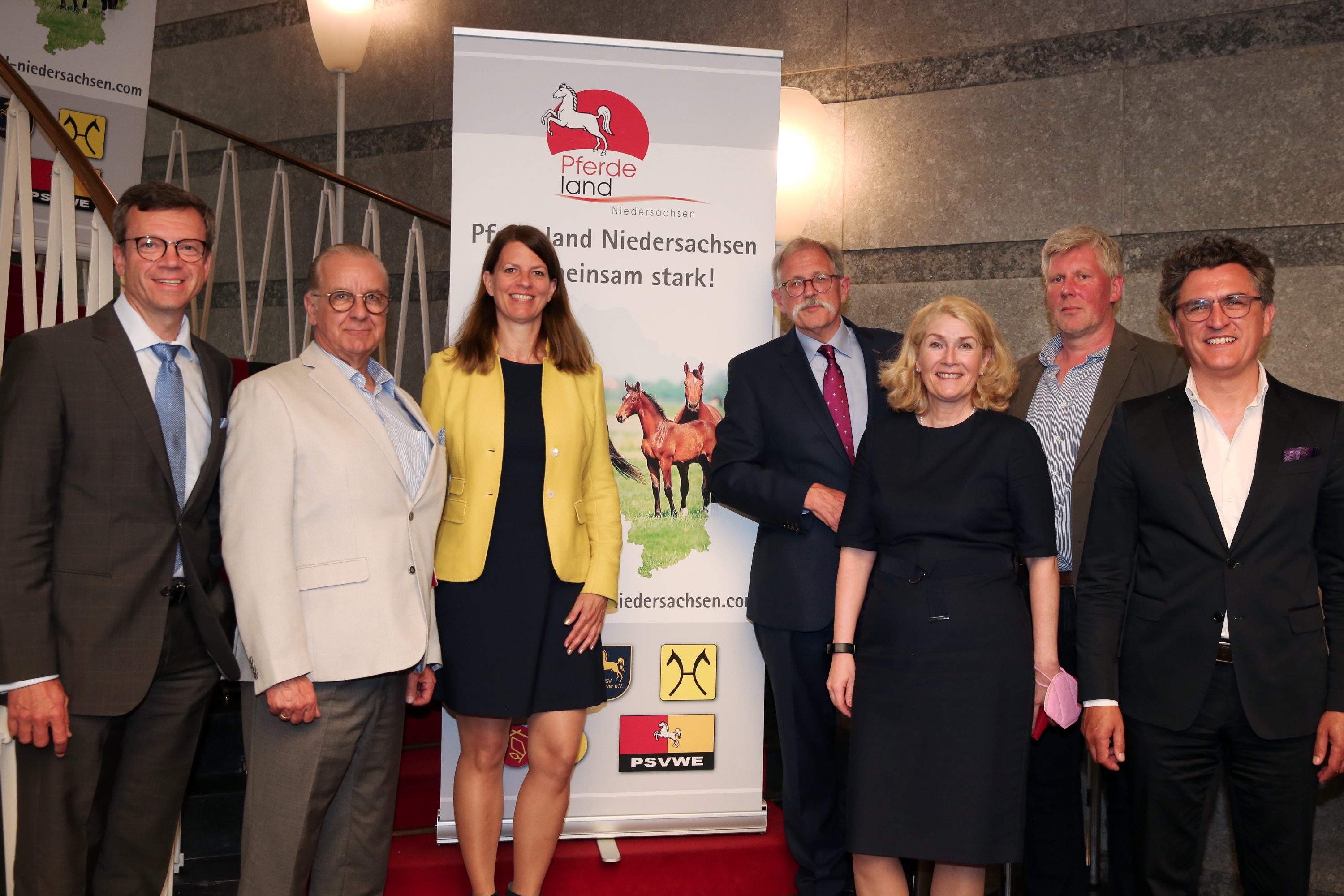 Erster Parlamentarischer Abend der Pferdeland Niedersachsen GmbH: Bernhard Feßler (Interessentvertreter FN, Hauptstadtbüro Berlin), Joachim Völksen (1. Vorsitzender des Verbandes der Pony- und Kleinpferdezüchter Hannover), Maike Bielfeldt (HGF der IHK Hannover), Martin Exner (Fachbeirat Pferdetourismus der PLN), Alexandra Duesmann (Geschäftsführerin der Pferdeland Niedersachsen GmbH), Helmut Habermann (Fachbeirat Wolf der PLN), Soenke Lauterbach (FN-Generalsekretär). Foto PLN/ Pantel