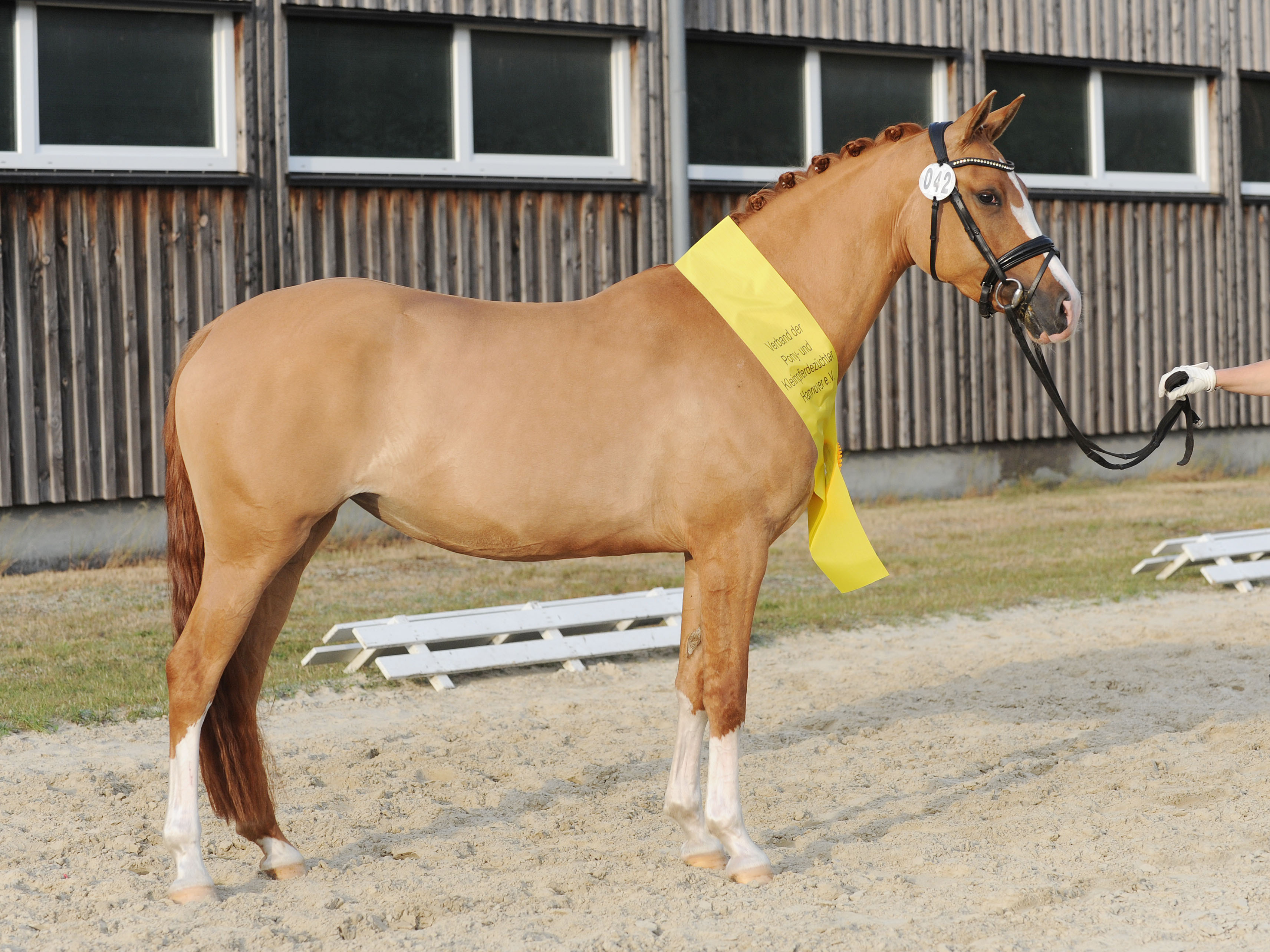 Die bewegungsstarke dreijährige Stute mit harmonischem Seitenbild und stabilem Fundament stammt aus der Zucht der ZG Pony Company, Steinfeld, welche die Stute ebenso vorstellte.