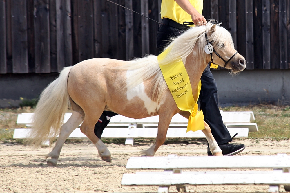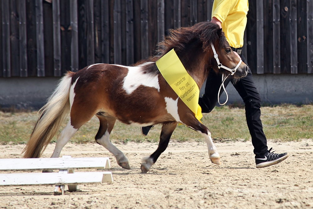 Die dreijährige braungescheckte Henrike-B (86 cm) v. Golden Theo B/Collytown Maverick gezogen und im Besitz von Heinfried Backhaus, Marklohe konnte mit ihrem harmonischen Seitenbild und ihrem aktiven Trab in guter Selbsthaltung überzeugen und erhielte die Siegerschärpe.