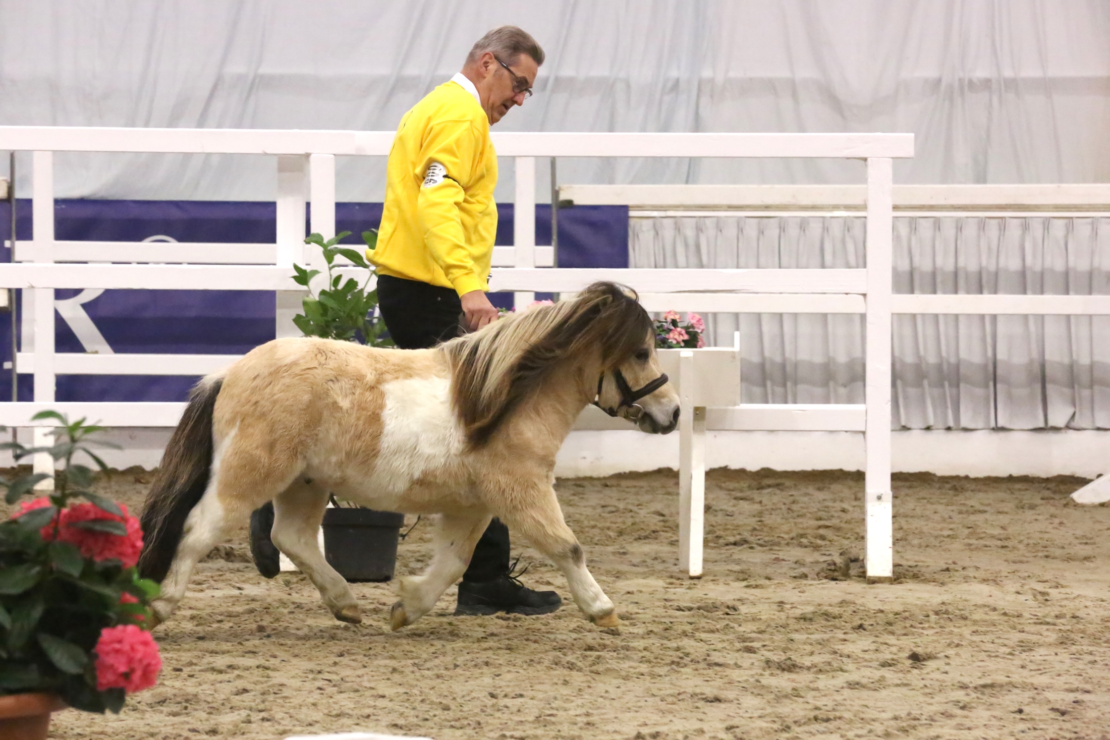 Der Reservesiegerhengst Petit Pamiro von Steffens v. Pinocchio von Kessen/Polaris v. Weyhe wurde gezogen und ausgestellt von Anna Katharina Brockmann-Steffens, Geestland. Der kräftig gebaute Braunisabellfalbschecke zeigte einen lockeren Trab durch den Körper und überzeugte auch mit seinem raumgreifenden taktsicheren Schritt. Für den Reservesiegerhengst bei den Shetland Ponys unter 87 cm wurde die silberne Medaille der Deutschen Reiterlichen