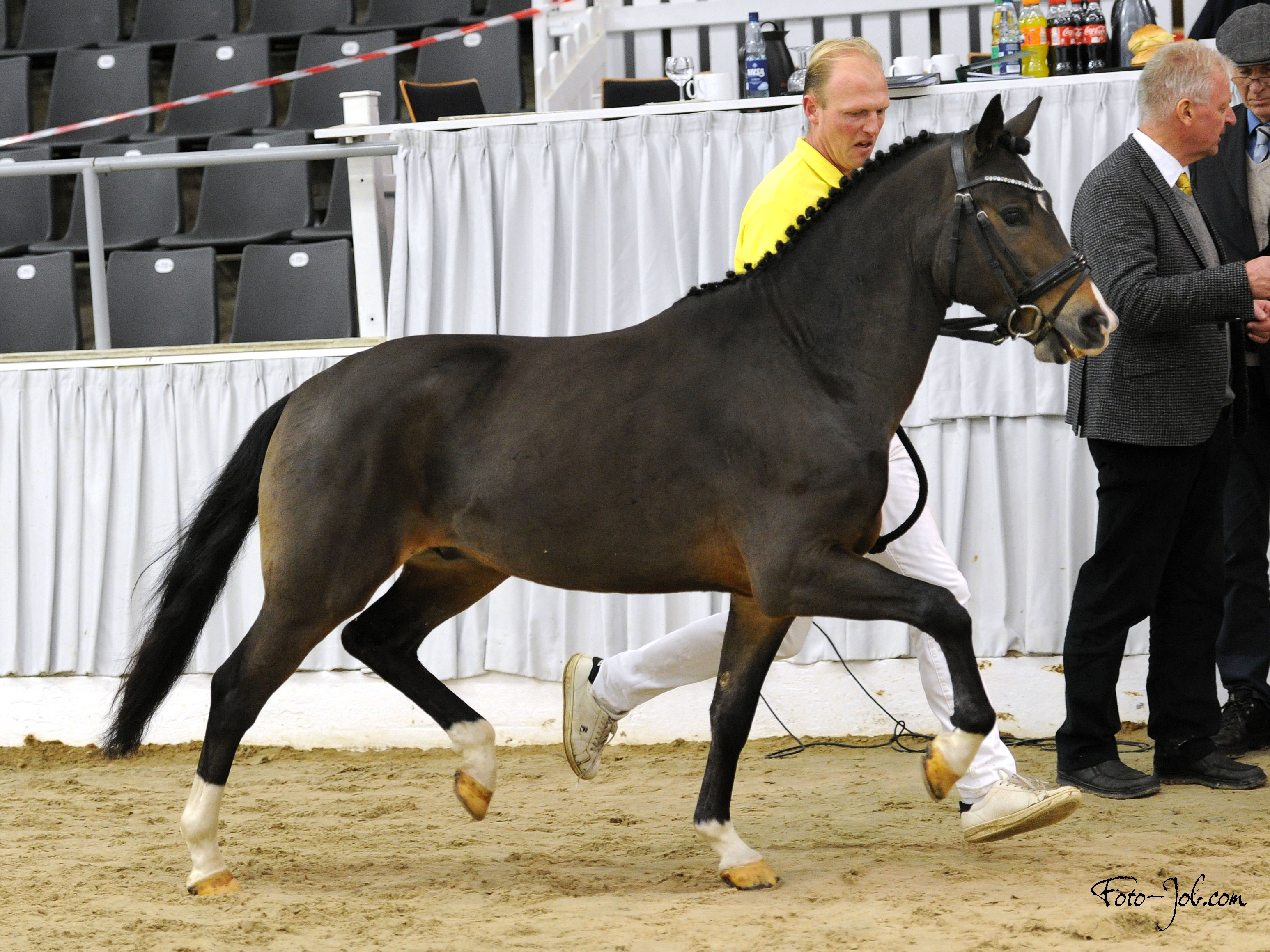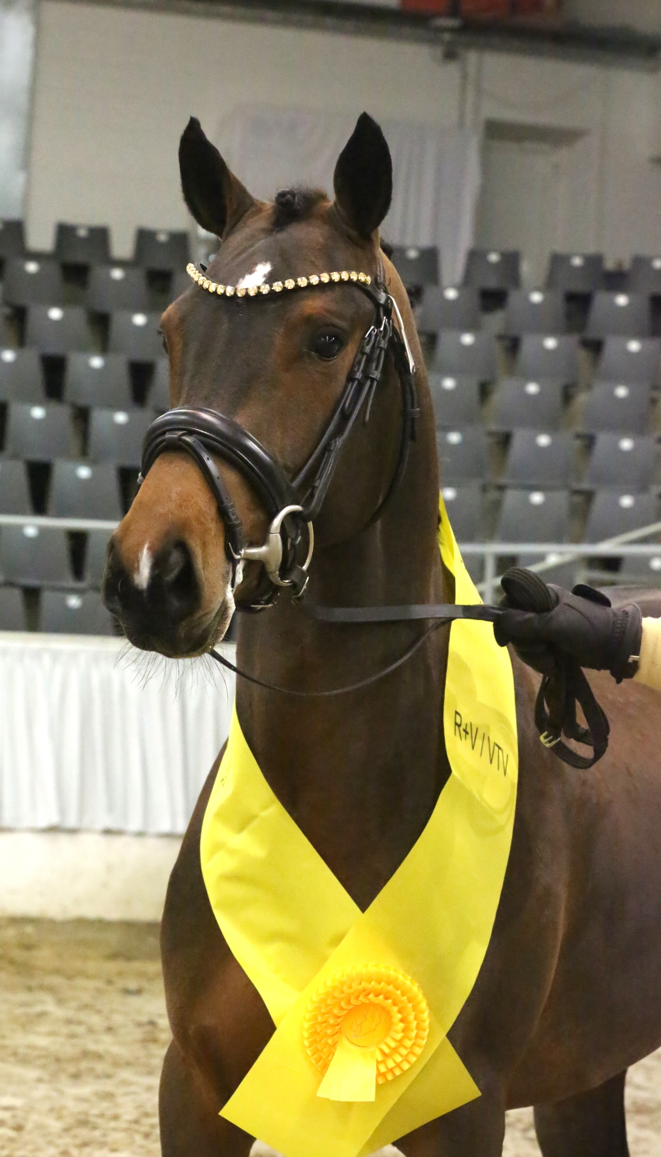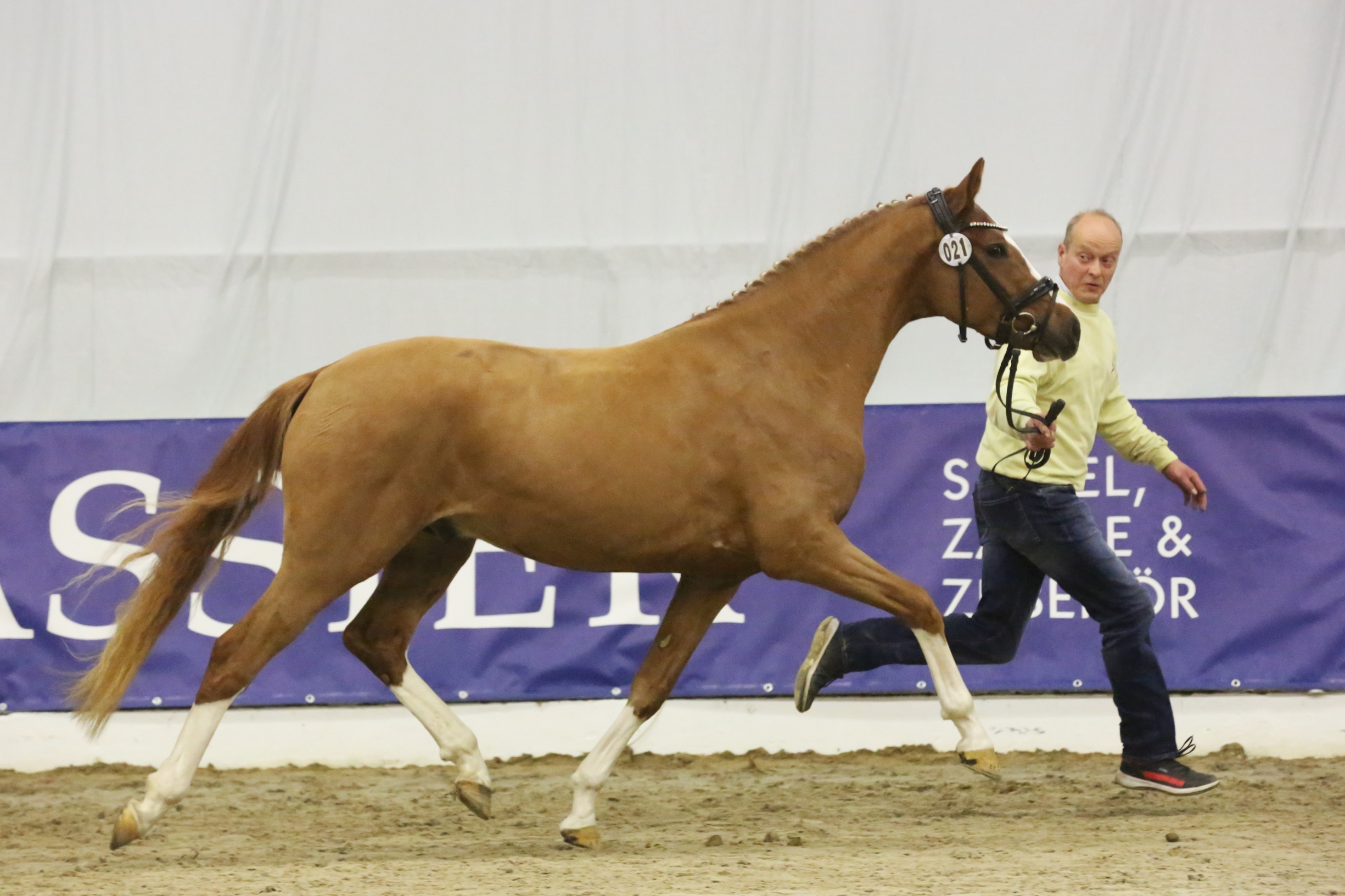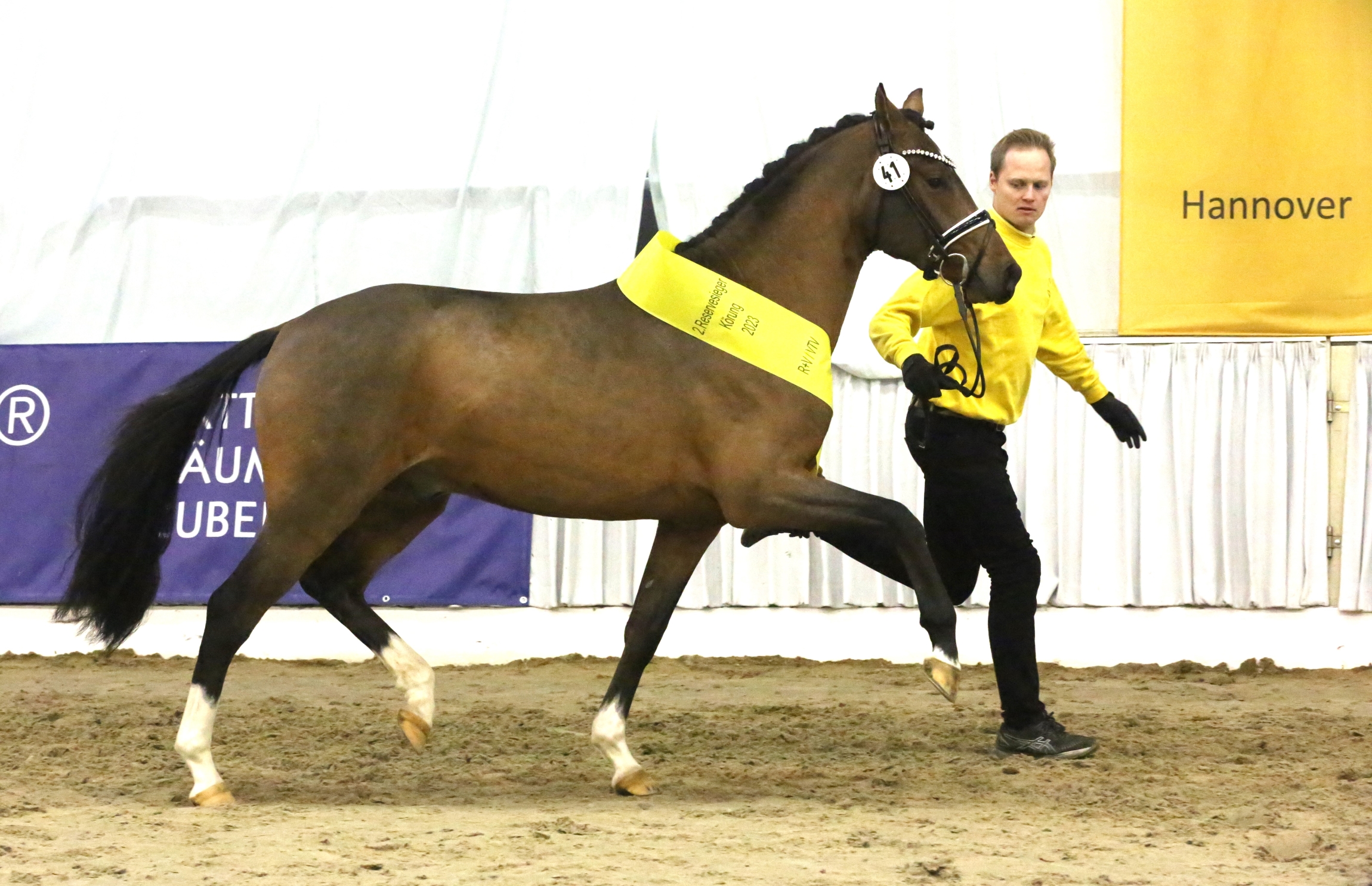 Als zweiter Reservesieger überzeugte Next Level v. FS Next Diamond/Cartier Deluxe aus der Zucht von Patrischa-Jana Schulte, Warendorf und im Besitz von Wenke Kraus, Rehburg-Loccum. Der bergauf konstruierte bewegungsstarke Braune präsentierte sich im Trab mit guter Schulterfreiheit und viel Schwung sowie einer bergaufgesprungenen Galoppade. Hierfür wurde die goldene Plakette für besondere züchterische Leistungen der Landwirtschaftskammer Niedersachsen vergeben.