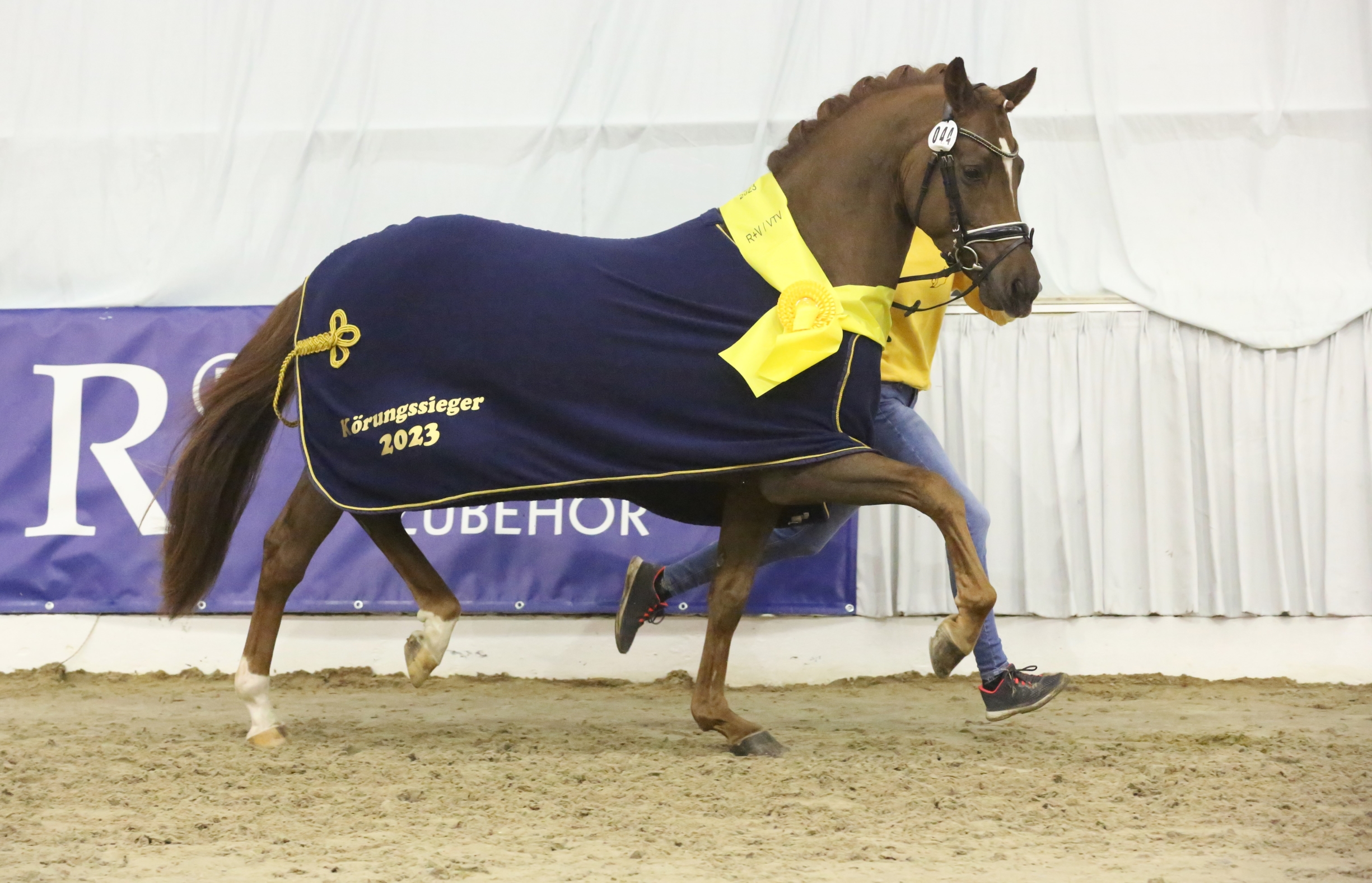 Alle fünf vorgestellte Hengste wurden gekört, der Reservesiegerhengst sowie der Siegerhengst wurden mit dem Titel Prämienhengst ausgezeichnet. Der Siegerhengst Ben von der Marren v. Baccardi aus dem Veischedetal/Dachs aus Waat stammt aus der Zucht von ZG Tiedemann, Midlum. ZG Tiedemann wurde mit der bronzenen Plakette des Niedersächsischen Ministeriums für Ernährung, Landwirtschaft und Verbraucherschutz für besondere tierzüchterische Leistungen ausgezeichnet.Der typvolle Fuchshengst mit gutem Fundament und harmonischer Oberlinie wusste sich auch in der Bewegung zu präsentieren, mit aktivem Trab in guter Aufrichtung.