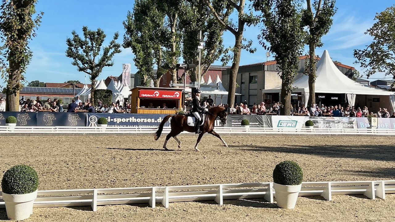 Nachdem sich Herzdieb JR am Freitag für das Finale der 5- und 6-jährigen Vielseitigkeitsponys qualifiziert hatte, zeigte er sich auch am Samstag in guter Form. Der von Herzkönig/Pikachu abstammende Hengst aus der Zucht und im Besitz von Jens Reents, Langenhagen, präsentierte sich unter Belissa Müller-Winterscheid mit konstanten Leistungen. In der Springponyprüfung Kl. A** erreichte er mit der Wertnote 7,5 den 6. Platz, in der Dressurponyprüfung Kl. A mit der Wertnote 7,6 den 4. Platz. Damit rangiert er vor der morgigen Finalentscheidung auf dem bronzenen dritten Rang.