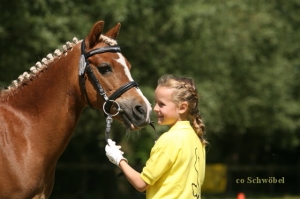 Ayleen George folgte in der Abt. der 14 – 25 jährigen auf Platz zwei, hatte sich ihre Reitponystute Primera in der Vorführrunde doch ein wenig ungestüm gezeigt. Bewundernswert allerdings wie cool Ayleen damit umging. Aber die beiden Mädchen sind eben auch schon erfahrene „alte Hasen“ in Jungzüchterwettbewerben. Platz drei ging in dieser Abteilung an Katharina Schnehage mit der Haflingerstute Olina.
