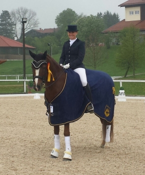 Burghof`s Delano v. Don`t Worry Be Happy / Folklore Züchter: Günter Voß, Springe / Besitzer: Dr. Claudia Michl, Aibling , belegte beim Turnier in Bohmerhof (Bayern) 1.- 4. Mai 2014 , Platz 1 in einer **M-Dressur mit Tatjana Schneider - Platz 6 in einer **M-Dressur mit Tatjana Schneider - Platz 3 in einer *M-Dressur mit Claudia Michl